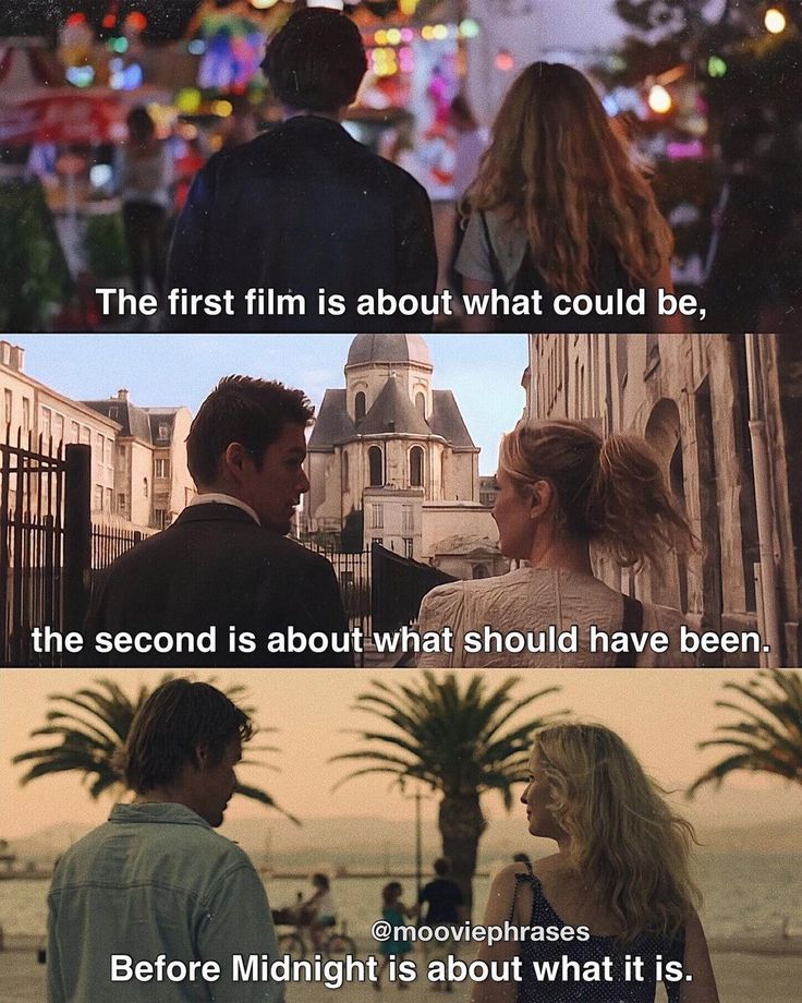 The Before Sunrise trilogy consists of three films โ Before Sunrise (1995), Before Sunset (2004), and Before Midnight (2013) follows the evolving relationship between Jesse and Celine as they meet by chance on a train and develop a deep connection over the course of nearly two decades. Each film takes place in a single day, several years apart, capturing their raw and philosophical conversations as they navigate love, longing, and the passage of time. Known for its exploration of intimacy, the trilogy offers an honest look at the complexities of modern relationships at different life stages.